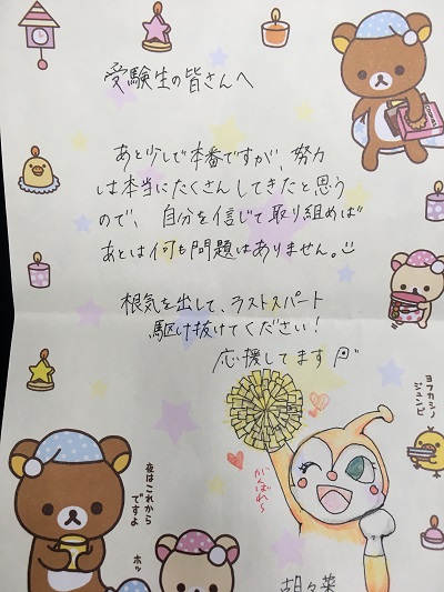 昨日は12期生のここが受験生に差し入れを持ってきてくれました。