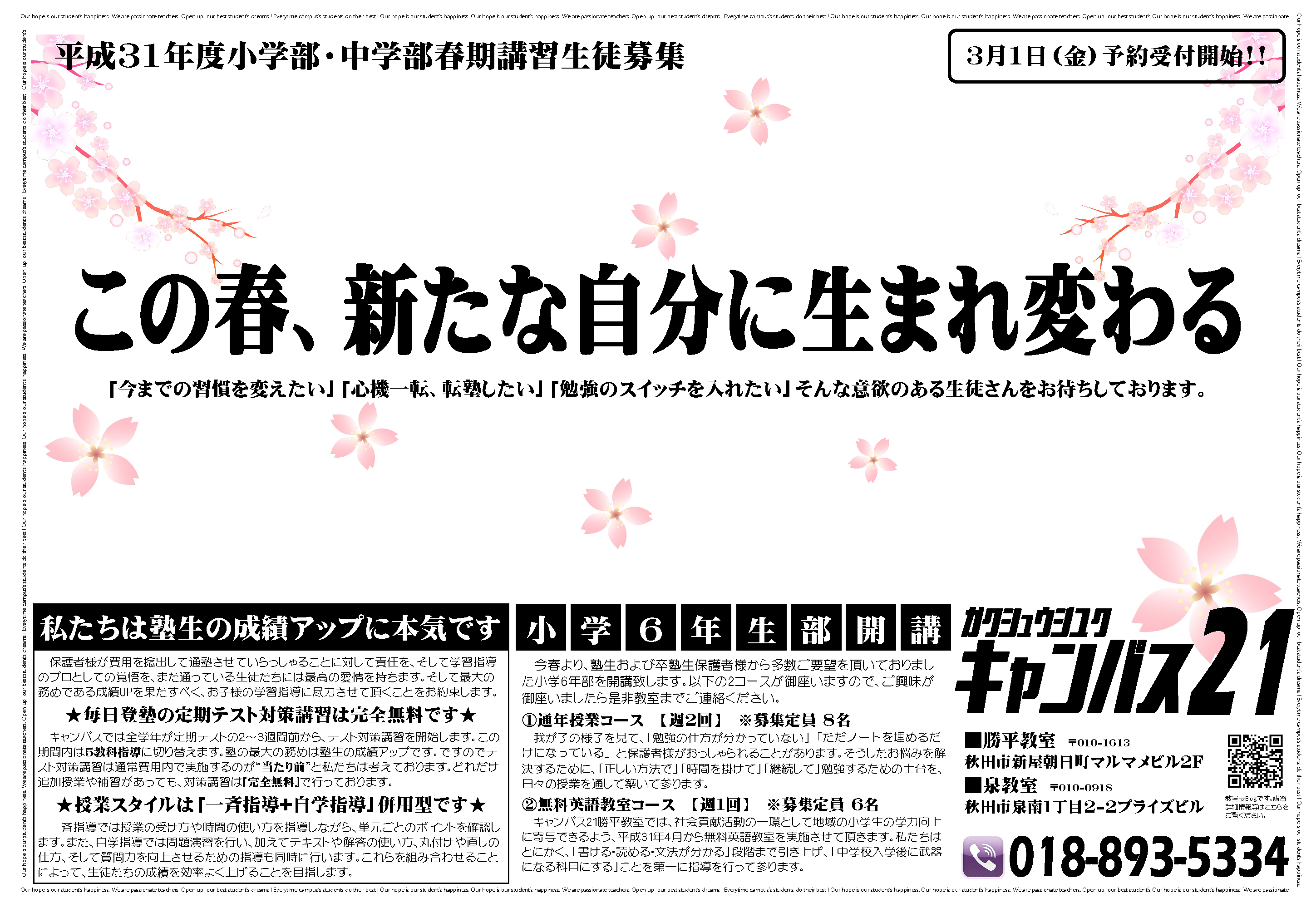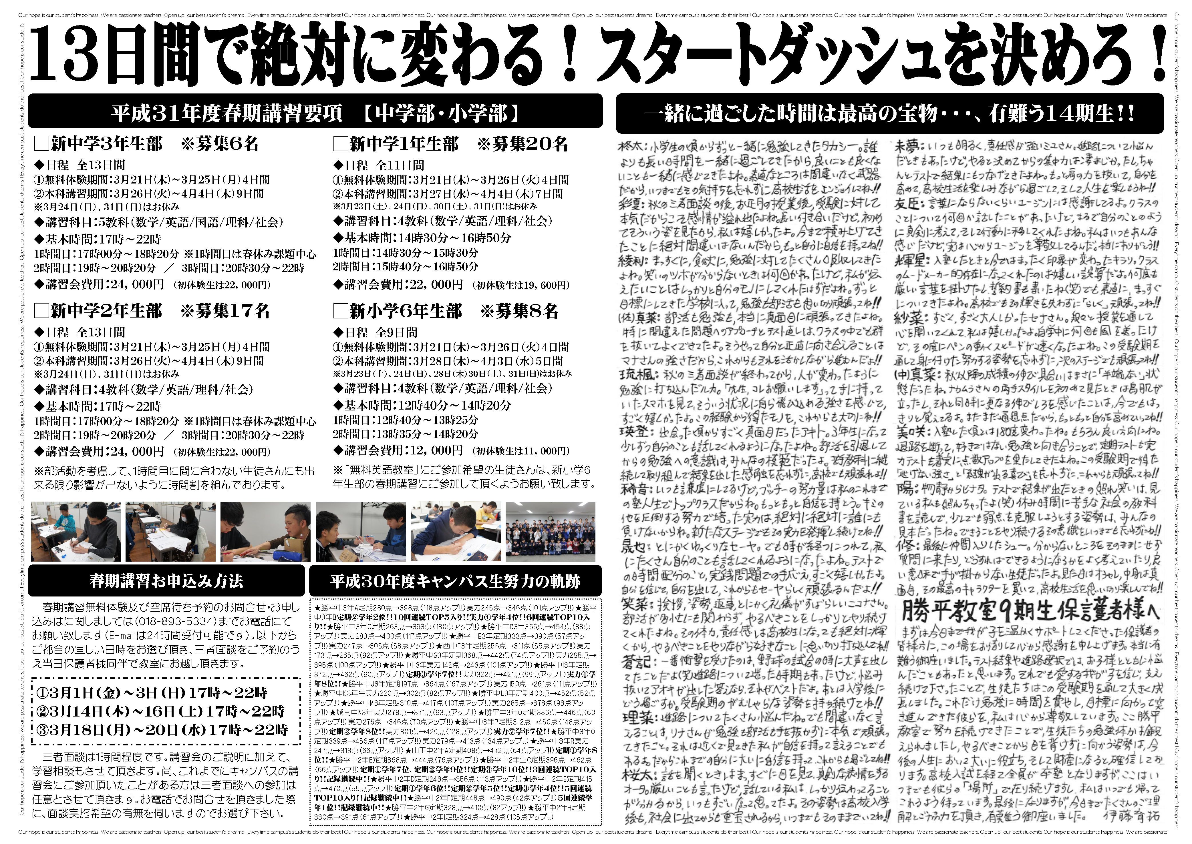 平成31年度勝平教室春期講習(小6・中学生対象)のご案内 平成31年度勝平教室春期講習(小・中学生対象)の案内PDFダウンロードはこちらから « 古い記事 新しい記事 » 関連記事 May.29①だから出来ないんだって… ※最新情報※ ★キャンパス卒塾生による高校受験体験記はこちらです ※残席情報※5月13日更新 中学3年生…募集中(5名) 中学2年生…定員満席募集停止中 中学1年生…募集中(4名) 但し、中学2年生の来年度入塾の早期予約 […] June.02①学習塾の選び方~旧ブログより~ ※最新情報※ ★キャンパス卒塾生による高校受験体験記はこちらです ※残席情報※6月1日火曜日 先週から、通常の体験授業に加えて、少しずつ夏期講習のお問い合わせを頂いております。現在、夏期講習の準備を進めておりますが、今年 […] さぁ頑張れ、16期生 来週には実力テストを控えている中学3年生… 定期テスト、課題テストがやっと終わった子も少なくないのですが、 今週は直ぐに切り替えて、 昨日までで実力テストに向けての過去問演習を重ねてきました。 あとは、 その結果を踏まえ […] この投稿へのコメント コメントはありません。 コメントを残す コメントをキャンセルメールアドレスが公開されることはありません。 ※ が付いている欄は必須項目ですコメント ※ 名前 ※ メール ※ サイト Δ この投稿へのトラックバック トラックバックはありません。 トラックバック URL