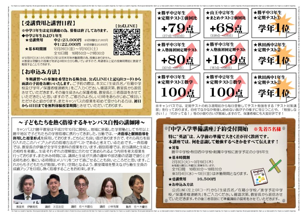 今回の冬期講習では、中学2年生および中学1年生を募集しております。